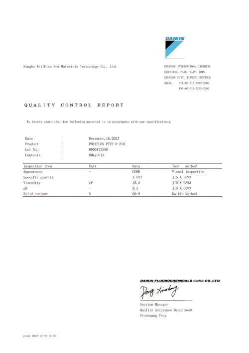 Quality Control Report-DAIKIN POLYFLON PTFE